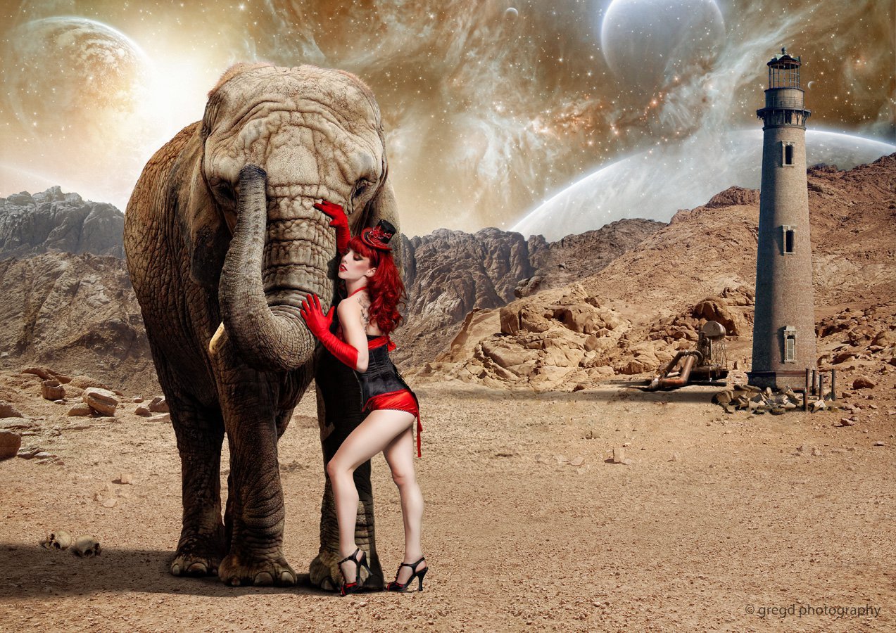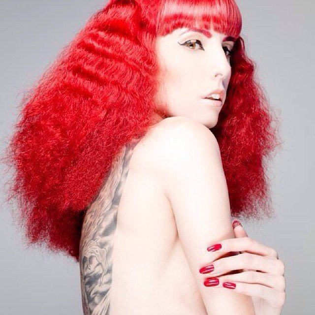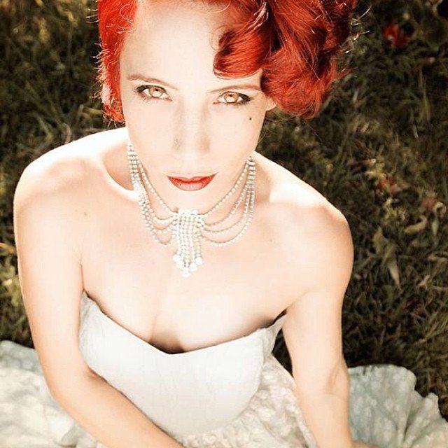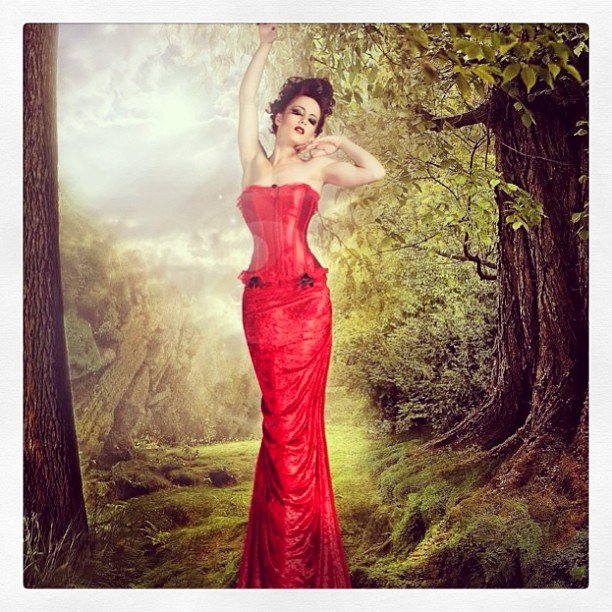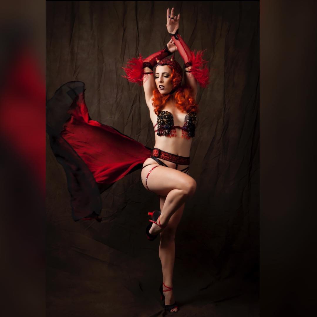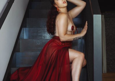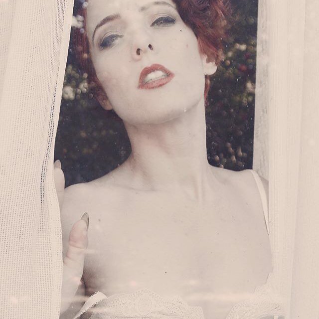 image of a Burlesque dancer with red hair wearing red lingerie near a window