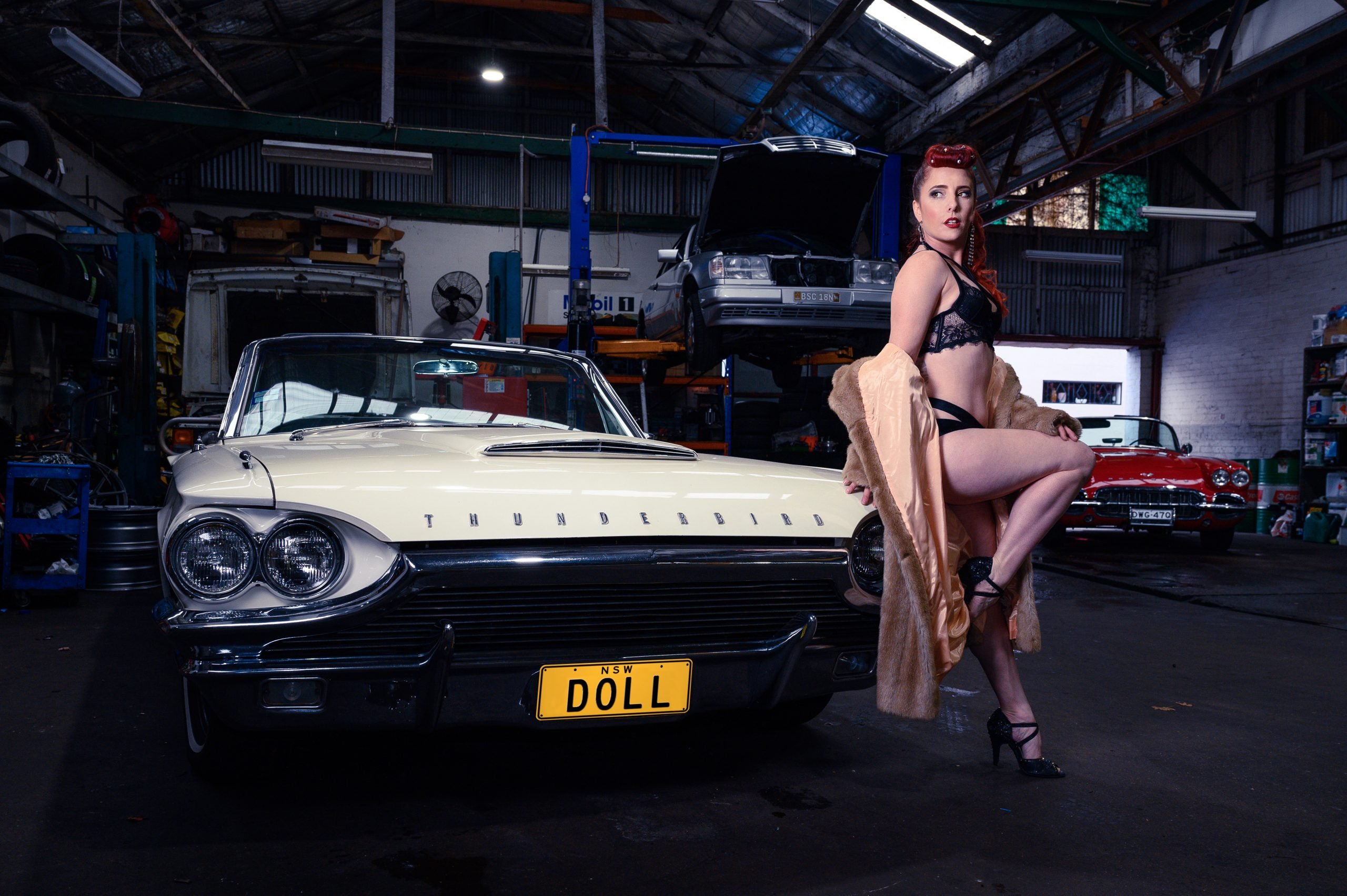 image of a woman with red hair wearing black lingerie standing next to a white Thunderbird Vintage Car